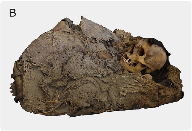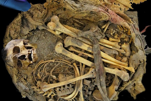 Hna Hnu’nun kalıntılarının açıldığı an. Bu kalıntıların yaklaşık 1.000 yıl boyunca korunmasına olanak tanıyan, kuru bir ortamdı. Araştırmacılar, kalıntılardan bir koprolit ve bağırsak dokusu izole ederek, Hna Hnu’nun yaşadığı dönemde hala mevcut olan bakterilerin DNA’sını çıkarmayı başardılar. C: Rosas-Plaza et al. 2025.