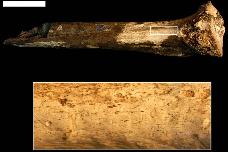 Belirgin et çıkarma işaretlerine sahip bir hominin kaval kemiği. C: Jennifer Clark
