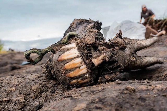 Kurganda, bazıları hala ağızlarında gemlerle on sekiz at bulundu. C: Trevor Wallace