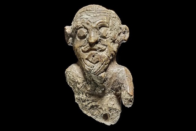 Heykelcik, mors fildişinden oyulmuş ve yaklaşık 3 cm boyunda. Çok hasarlı olsa da, kendine özgü saç stili ve sakalı hala açıkça görülebiliyor. C: Roberto Fortuna, National Museum of Denmark
