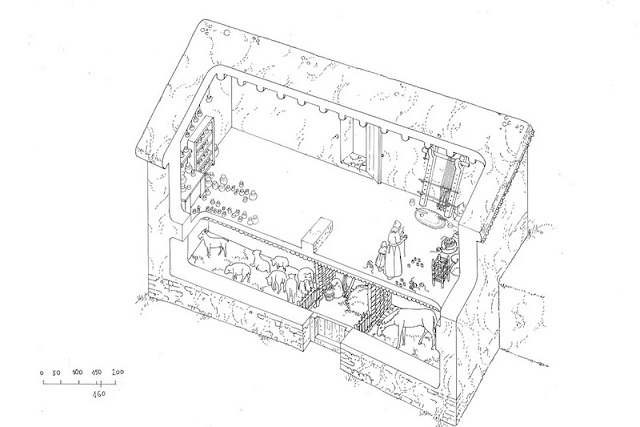 Arkeologlar, MÖ 3. yüzyılın son çeyreğinde çıkan bir yangında tahrip olan, ahşap tavanlı ve katlar arasında ahşap bölmeli, iki katlı bir çiftlik evinin kalıntılarını buldular. C: Illustration by Francesc Riart