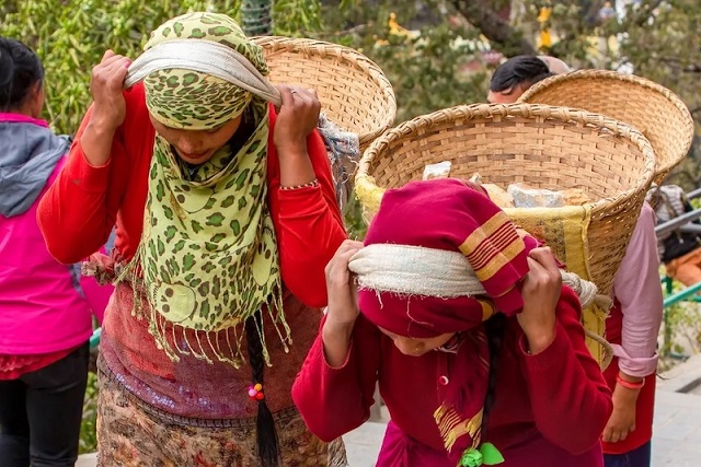 Günümüz Nepalinde kadınlar sepet taşımak için tumpline kullanıyor. C: VW Pics