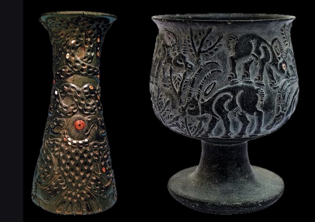 Solda: Jiroft vazosunda kartal figürünün gözü yeribe kırmızı bir değerli taş yerleştirilmiş. Sağda: Bu klorit kadehin üzerinde otlayan keçiler ve uzun boynuzlu yaban koyunları tasvir edilmiş. C: Madjidzadeh Y.
