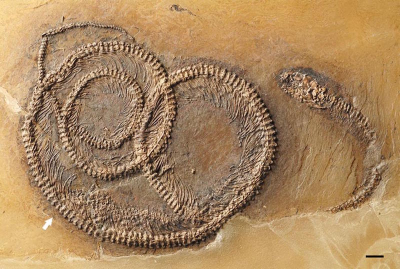 48 milyon yıllık fosil genç bir yılan, kertenkele ve böcekten oluşuyor. Beyaz okla gösterilen noktada yılanın midesindeki kertenkele görülüyor.