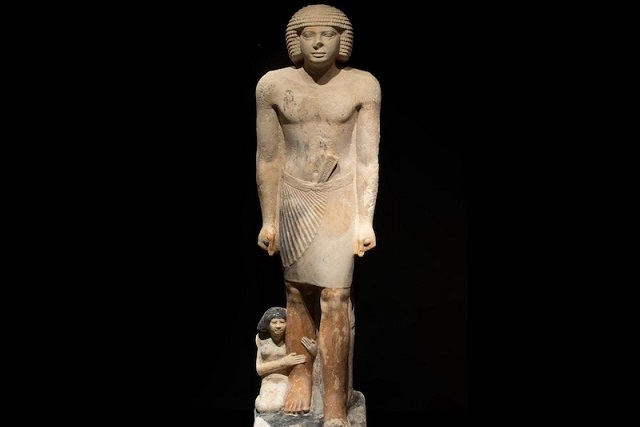 Antik Mısır’dan, ayakta duran bir soylunun heykeli, sağ bacağını tutan bir kadının (muhtemelen karısı) daha küçük bir tasviriyle birlikte görülüyor. C: Zahi Hawass