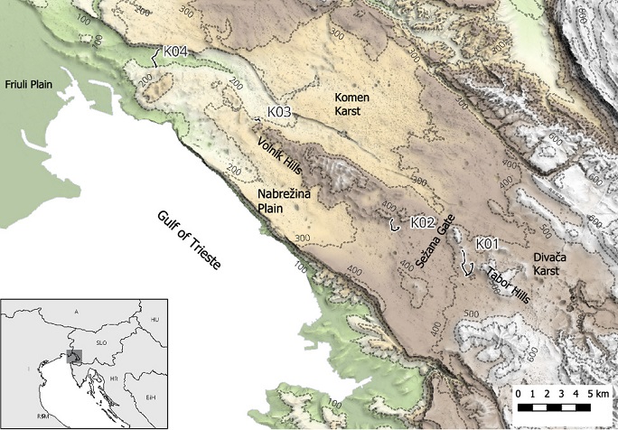 Kapak Görseli Kaynağı: Karst Platosu'nda tespit edilen dört huni şeklindeki taş yapıyı gösteren, çalışma alanının kuzey Adriyatik iç kesimindeki konumu. Harita, Trieste Körfezi'ni iç kesimlere bağlayan önemli arazi özelliklerini vurgulamaktadır. Mlekuz Vrhovnik & Fabec, 2025.