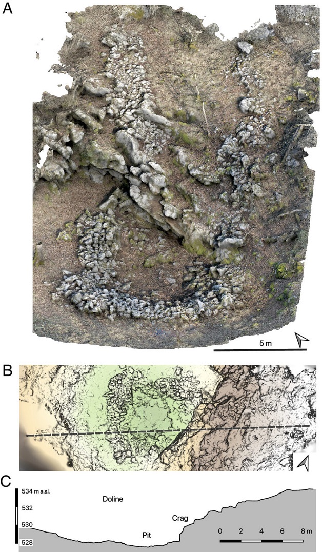 K01 yapısının tepesindeki terminal muhafaza (Çukur 2). (A) Muhafazanın, bir dolin (çöküntü) tabanındaki alçak bir kaya çıkıntısının altına yerleştirildiğini gösteren eğik 3B fotogrametrik görünüm. (B) Kesitin alındığı yeri işaretleyen kesikli bir çizgiyle muhafazanın yukarıdan aşağıya planı. (C) Dolin, kaya yüzeyi ve çukur arasındaki ilişkiyi gösteren, bu çizgi boyunca topografik bir kesit. Hem plan hem de kesit, doğrudan karşılaştırma için aynı ölçekte gösterilmiştir. Kaynak: Mlekuz Vrhovnik & Fabec, 2025.