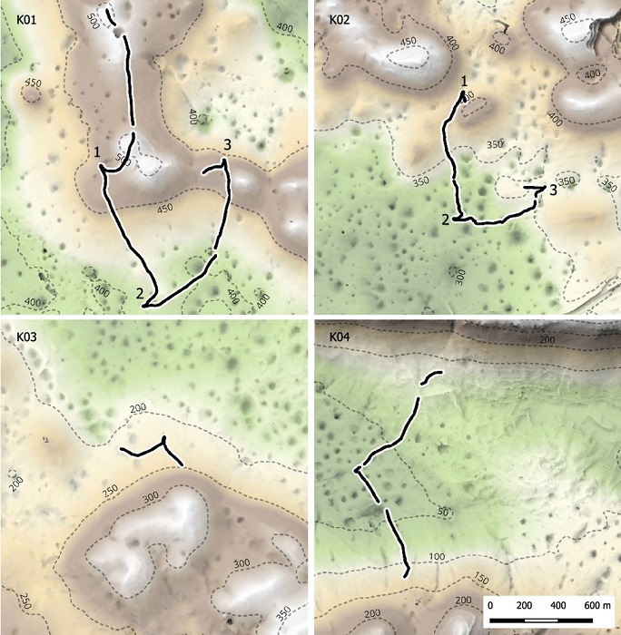 Havadan lazer taramasıyla tespit edilen dört huni biçimli taş yapının (K01–K04) planları, peyzaj düzenlemeleri içindeki kılavuz duvarları ve çukur alanlarını göstermektedir. Kaynak: Mlekuz Vrhovnik & Fabec, 2025.