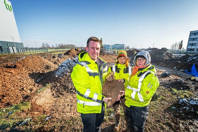 Arkeoloji ekibi (soldan sağa): Jan Rosbeck (Şehir Arkeoloğu), Rebecca Mehmen (Ruhr Üniversitesi Bochum Arkeoloji öğrencisi) ve Martha zur-Schaepers (Kazı Direktörü), kazılan bir at kafatasını sunuyor. Fotoğraf: Dortmund Belediyesi / Roland Gorecki