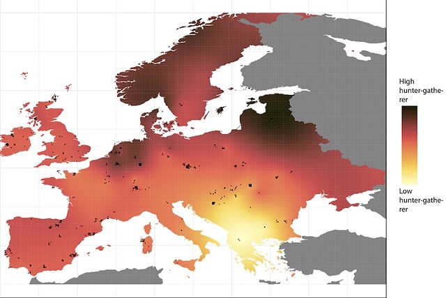 Avrupa genelinde MÖ 4.500-2.500 yılları arasındaki avcı-toplayıcı atalarının oranlarını gösteren harita. C: Huddersfield Üniversitesi