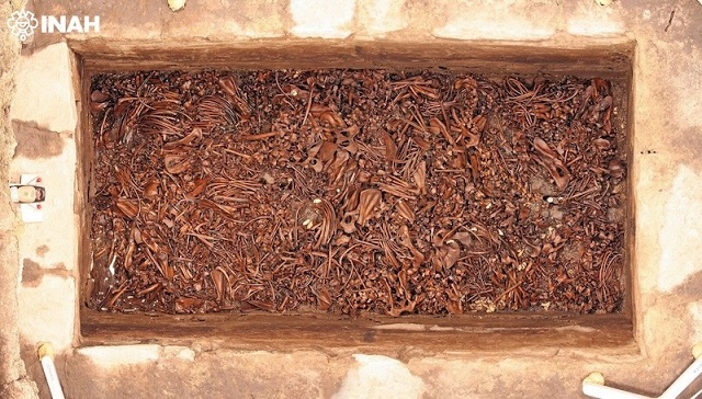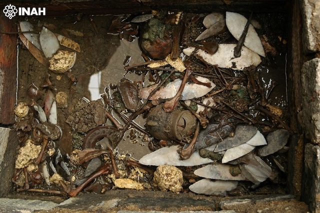 Tenochtitlan’da hayvan kemikleriyle dolu bir kurban çukuru. C: Tenoch Medina and Sergio Gaytán