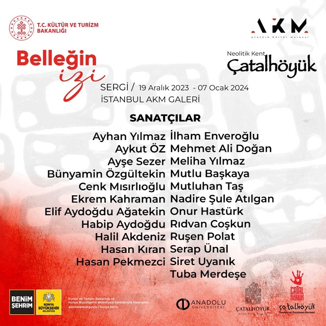 Arkeolojikhaber'in edindiği bilgilere göre; 19 Aralık 2023 tarihinden itibaren İstanbul AKM Galeri'de Belleğin İzi Neolitik Kent Çatalhöyük sergisinde eserleri yer alacak sanatçılar; Ayhan Yılmaz, Aykut Öz, Ayşe Sezer, Bünyamin Özgültekin, Cenk Mısırlıoğlu, Ekrem Kahraman, Elif Gündoğdu Ağatekin, Habib Aydoğdu, Halil Akdenizü Hasan Kıran, Hasan Pekmezci, İlhami Enveroğlu, Mehmet Ali Doğan, Meliha Yılmazü Mutlu Başkaya, Mutluhan Taş, Nadire Şule Atılgan, Onur Hastürk, Rıdvan Coşkun, Ruşen Polat, Serap Ünal, Siret Uyanık, Tuba Merdeşe olacak.