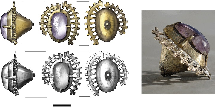 Mikroskobik incelemede ayrıca, mücevherin arkasında kurşun lehim izleri ve gümüş bir iğne bulundu. Bu, mücevherin başlangıçta büyük bir süs yapısına, muhtemelen bir aristokratın taktığı lüks bir broşa iliştirildiğinin kanıtıydı.