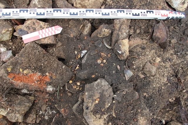 Arkeologlar, eski bir evin temelinin kazısı sırasında içi paralarla dolu kırık bir toprak kap buldu. C: Russian Academy of Sciences Institute of Archaeology