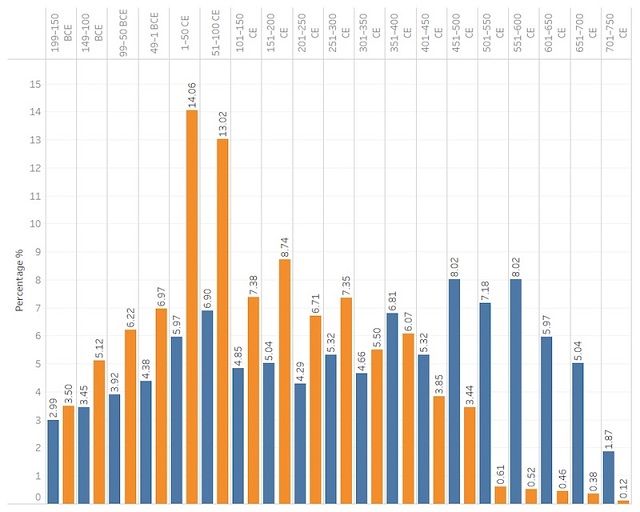 Harvard ve OXREP veri tabanlarına göre Akdeniz’in o yarısındaki toplam gemi enkazı sayısından her yarım yüzyıldaki gemi enkazlarının yüzdesini karşılaştıran grafik. Turuncu Batı Akdeniz’i, mavi Doğu Akdeniz’i temsil ediyor. C: Lev Cosijns ve Haggai Olshanetsky
