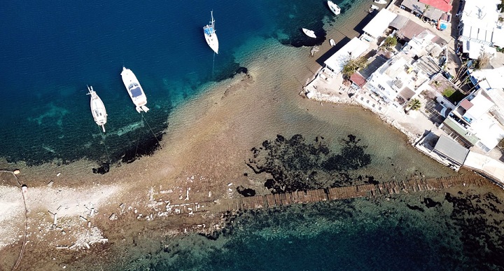 Muğla'nın Bodrum ilçesine bağlı Gümüşlük Mahallesi'nde, Mart 2026'da yaşanan deniz suyunun çekilmesiyle Tavşan Adası'na uzanan antik sur kalıntıları yeniden ortaya çıktı.