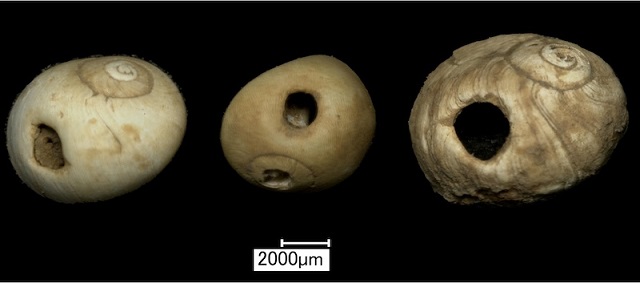 Heaning Wood Bone Mağarası’ndan delikli kabuk boncuklar. C: Martin Stables