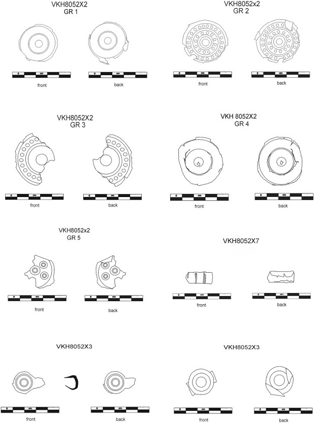 Hastrup hazinesinden seçilmiş nesnelerin çizimleri (tümü bronz). Levhalar (1-5 alt gruplarıyla birlikte 2 adet), tüpler (7 adet) ve daha küçük levhalar (3 adet). Çizimler Ziba Yahyavi'ye aittir. Kaynak: Felding vd., 2025.