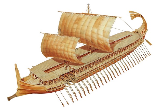 Trireme, klasik Yunanistan’da tercih edilen savaş gemisiydi. Daha sonra Akdeniz’deki Kartacalılar ve Romalılar gibi diğer bölgesel güçler tarafından kullanıldı ve tasarımı geliştirildi. (C: SOL 90/ALBUM)