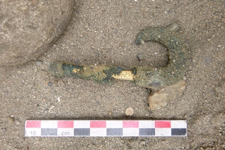 Gövdenin etrafına altın şerit sarılı bu büyük bakır kanca, bölgedeki balıkçılık mirasının bir kanıtı. (C: Gabriel Prieto)