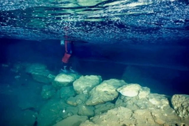 Sualtı mağarasının içinde bulunan kireçtaşı köprünün su altı görünümü. C: Bogdan Onac