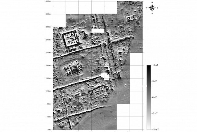 Sezyum manyetometresiyle çekilmiş, konut binaları ve tapınakların bulunduğu bir mahallenin görüntüsü. C: Charax Spasinou Project 2016 (Jörg Fassbinder)