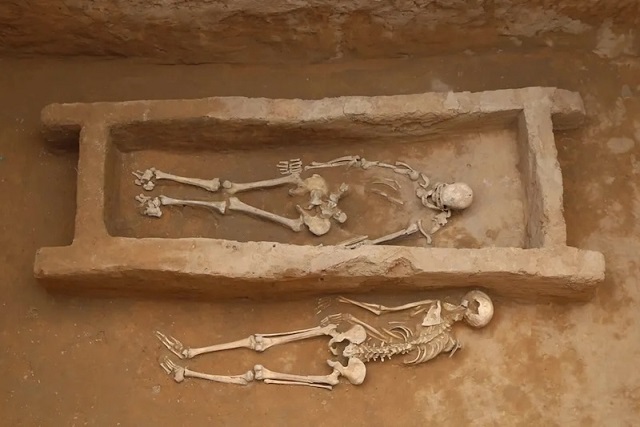 Çin’deki Zhaishan bölgesinde bulunan bir seçkin mezarı. Mezarda bir erkek ve kurban edilen bir kadın figürü görülüyor. C: IVPP/CAS