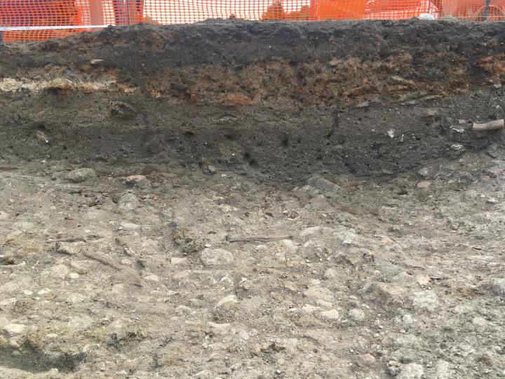 Coupe stratigraphique de la voirie gauloise avec remplissages successifs.
