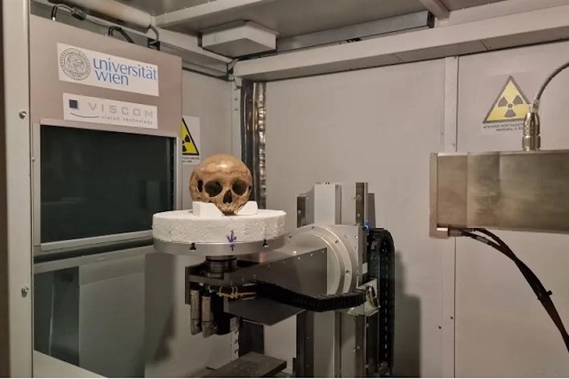 Efes’teki Octagon yapıda bulunan kafatası, Viyana Üniversitesi’nde mikro-BT taramasından geçiyor. C: Gerhard Weber / University of Vienna