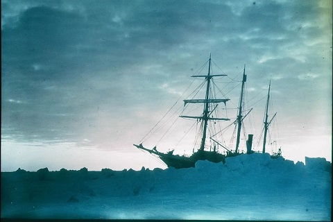 1915 kışının derinliklerinde Weddell Denizi buz kütlesinde donmuş Endurance. C: Mitchell Library / State Library of New South Wales