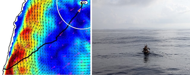 (Solda) Deneysel yolculuğun sonuna doğru GPS takibi ve okyanus akıntılarının modellenmesi. (Sağda) Soldaki görüntünün çekildiği dönemdeki ekip. C: Kaifu et al. 2025.