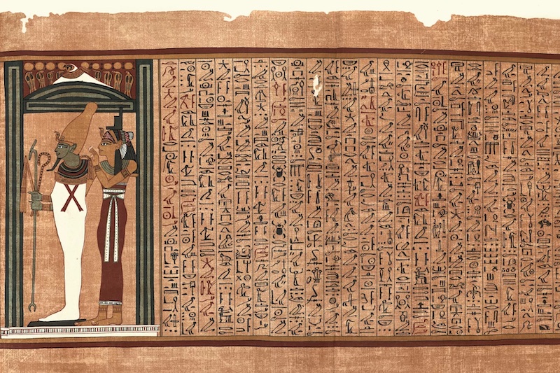 Ani Papirüsünden, Yeni Krallığın 19. Hanedanlığı döneminde, yaklaşık MÖ 1250’den kalma el yazısı hiyeroglifleri olan bir parşömen üzerinde İsis (sağda) ile birlikte Osiris’i (solda) gösteren eski bir illüstrasyon.