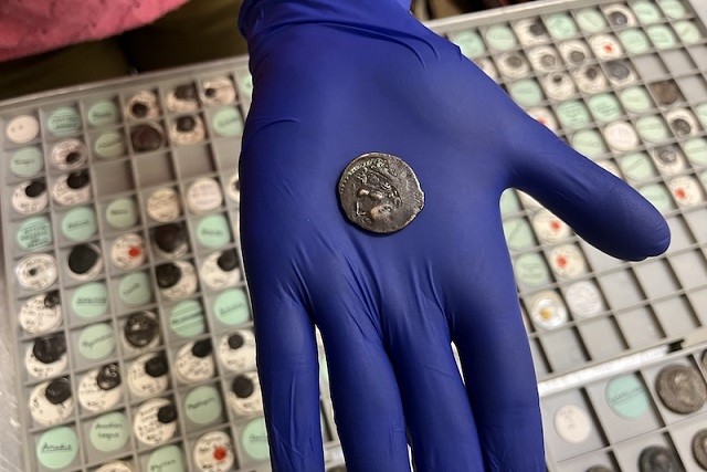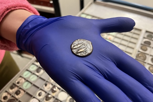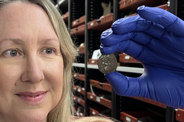 Leeds Müzesi ve Galerileri’nin arkeoloji ve nümismatik küratörü Kat Baxter, antik sikkenin ön yüzünü gösteriyor. C: Leeds City Council