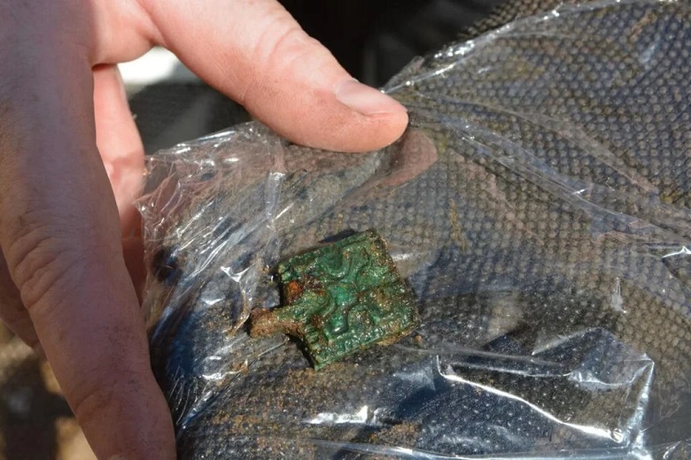 Mezar yerinde bulunan bir kemeri süsleyen rozet desenli bronz süslemelerden biri. Fotoğraf: Juha Ruohonen / Turun yliopisto