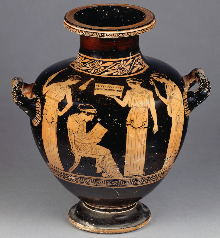 Gerçek kadın cinselliğinin kanıtını, genellikle erkek bakış açılarını yansıttığı için, antik Yunan ve Roma objelerinde bulmak zordur. Antik Yunan’da kadınlar genel olarak kamusal yaşamdan ve siyasetten dışlanmışlardı, ancak yerli ve dini ritüellere katılıyorlardı. Midilli adasında yaşamış olan şair Sappho (MÖ 630–570), kadınlara ve kadın arzusuna ses vermişti. Sappho, muhtemelen bu su kabının üzerinde oturan figürde betimlenmişti. 19. yüzyılda, Sappho’nun şiirleri, Lesbos (Midilli) sakinleri için kadınları seven kadın için kullanılan bir terim yarattı. Sappho’nun yaşamı hakkında kesin olarak az şey biliniyor ancak şiirleri daha sonraki dönemlerde yaşayan birçok kadın için ilham kaynağı oldu.