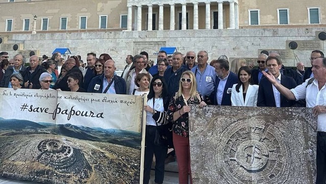 12 Ekim 2025’te Atina’da Yunan parlamentosu önünde Papoura Tepesi’nin korunmasına yönelik protesto. C: Minoa Pediada Belediyesi