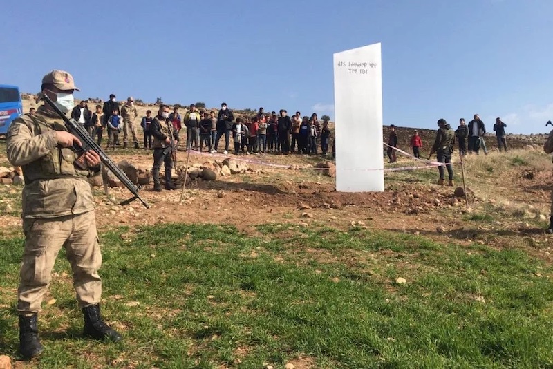 Araziye dikilen metal bloğu gören mahalleli, durumu jandarmaya bildirdi. İhbar üzerine bölgeye gelen jandarma ekipleri çevrede önlem alırken, Kültür ve Turizm İl Müdürlüğü ekipleri de blokta inceleme yaptı.