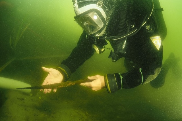Bir dalgıç, Polonya’daki Lednica Gölü’nden Orta Çağ’a ait bir mızrak ucunu sudan çıkarıyor. C: Marcin Trzcinski