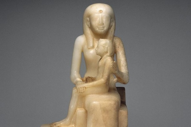 Kraliçenin kucağında küçük firavunu tuttuğu bu alçıtaşı heykel, alışılagelmiş Mısır sanatının aksine kraliçeyi firavundan çok daha büyük tasvir ederek onun siyasi otoritesini simgeliyor. (Kaynak: Brooklyn Museum)