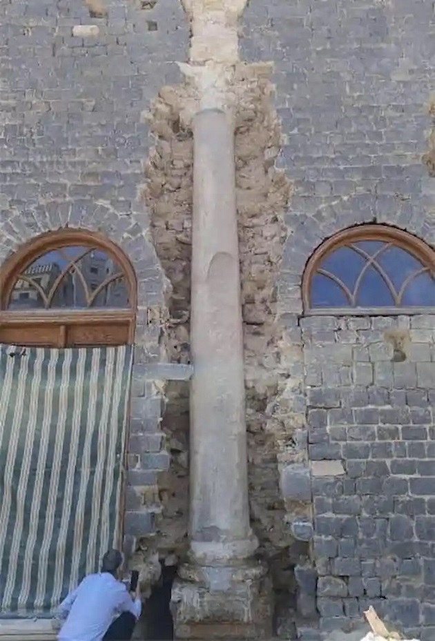 Homs Ulu Camii'nin içindeki sütun kaidesinde yeni keşfedilen Yunanca yazıt bulunmaktadır; bilim insanları, Roma dönemi Suriyesi'ne özgü, yerel Süryanice (Aramice) dilsel arka planı yansıtan yazım ve dilbilgisi düzensizliklerine dikkat çekiyor. Kaynak: Abdulhadi Al-Najjar.