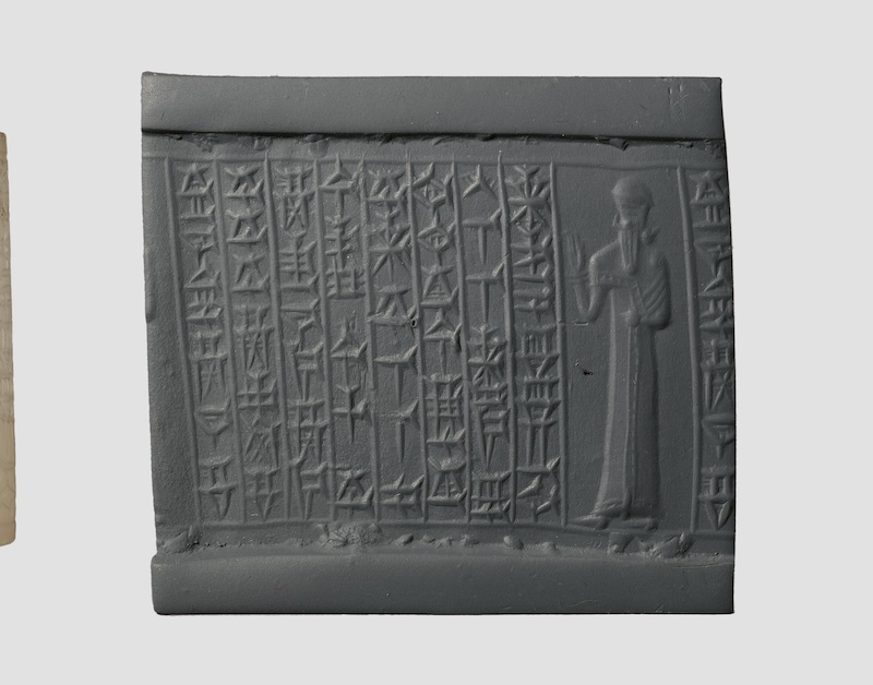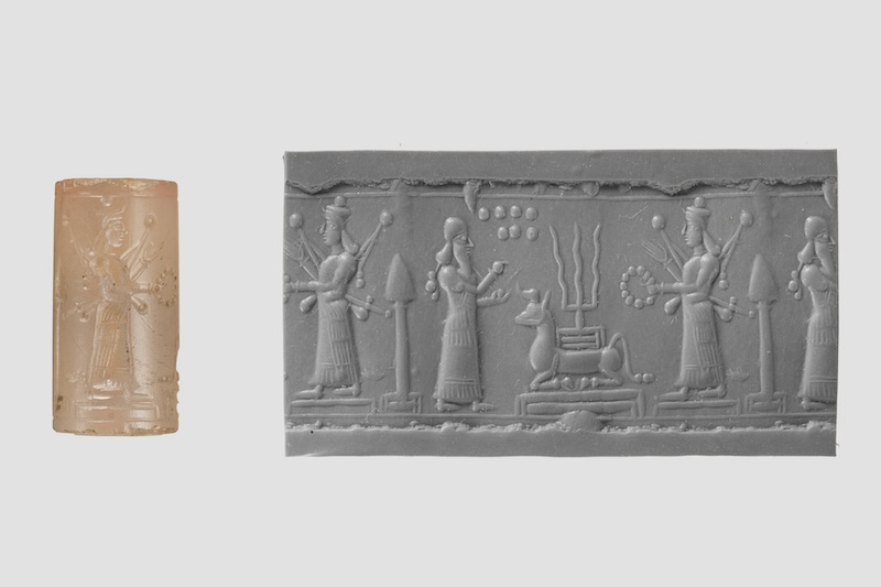 MÖ 9. yüzyıl sonu ile 7. yüzyıla tarihlenen, kalsedondan yapılmış ve üzerinde bir kült sahnesi bulunan Asur silindir mührü. Sağdaki resim, mührün bıraktığı izi gösteriyor. C: Metropolitan Sanat Müzesi.
