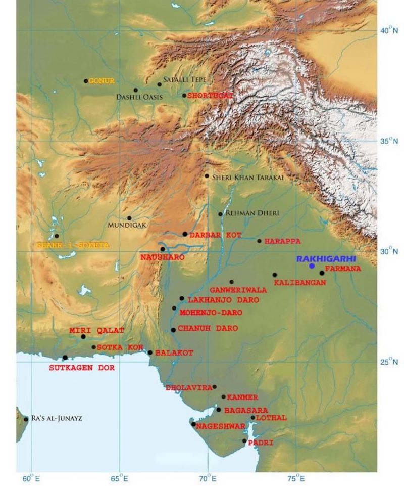 Bu harita, Rakhigarhi (mavi), diğer önemli IVC sahalarının (kırmızı) ve diğer arkeolojik kültürlerden (diğer renkler) kuzeydeki ve batıdaki sahaların konumunu gösteren Indus Vadisi Medeniyetinin (IVC) coğrafi aralığını gösteriyor. C: Vasant Shinde / Deccan College Post Graduate and Research Institute