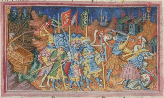 İngiliz Kütüphanesi Harley 2278'in 48r numaralı yaprağında yer alan, Ívarr ve Ubba'nın kırsal bölgeyi yağmalamasını gösteren on beşinci yüzyıla ait bir tasvir. Kaynak: Kamu Malı – Vikipedi Commons