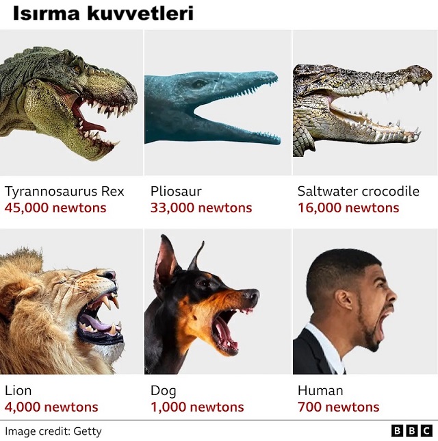En üst noktada bu yaklaşık 33.000 Newton olarak ortaya çıkıyor. Karşılaştırmak gerekirse, şu anda yaşayan hayvanlardaki en güçlü çenelerin 16.000 Newton ile tuzlu su timsahlarında bulunduğu belirtiliyor.