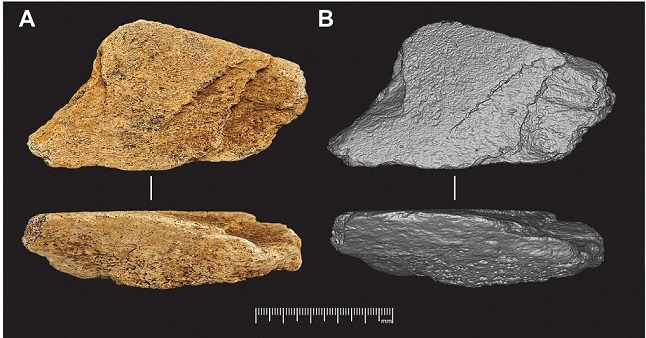 Fosilleşmiş kemik parçası kabaca üçgen şeklinde olup, yaklaşık 11 santimetre uzunluğunda, 6 santimetre genişliğinde ve 3 santimetre kalınlığındadır; yani yaklaşık bir insan avuç içi büyüklüğündedir. Mikroskobik analiz, kasıtlı şekillendirme, darbe izleri ve kenarları boyunca çentikler ortaya koymuştur; bunların hepsi, parçanın kasıtlı olarak üretildiğini ve bir alet olarak tekrar tekrar kullanıldığını açıkça göstermektedir.