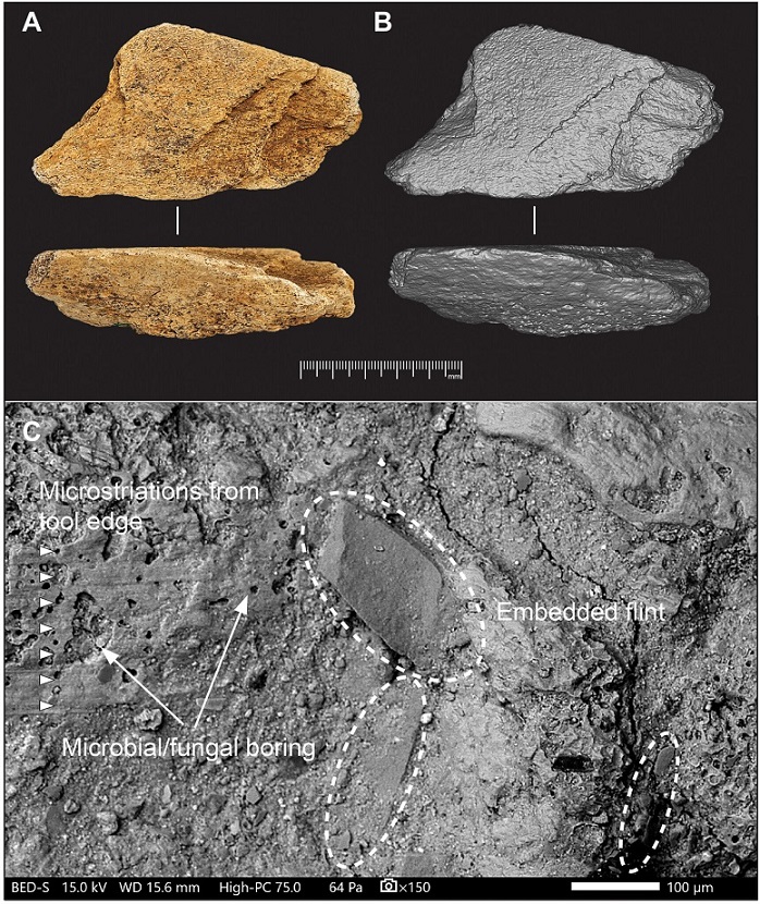 Boxgrove Su Birikintisi Alanı'ndan (Q1/B) fil kemiğinden yapılmış alet (NHMUK PV UNREG 4339). (A) Fotoğraflar ve (B) 3 boyutlu yüzey modelleri, çakmak taşı yontma aleti olarak kullanımından kaynaklanan dış kortikal yüzeydeki girintileri göstermektedir. Yan görünümler, korteksin derin yontulmasını ortaya koymaktadır. (C) SEM görüntüleri, mikro çizgiler ve gömülü çakmak taşı parçaları (kesikli ovallerle işaretlenmiş) gibi kullanım aşınması özelliklerinin yanı sıra tortu sonrası biyolojik aşınmayı da göstermektedir. İnce kum ve silt yamaları, çukurları kısmen doldurmakta veya örtmektedir. Kaynak: Londra Doğal Tarih Müzesi Mütevelli Heyeti, Parfitt & Bello, 2026 -Science Advances