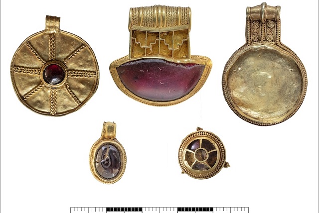 İngiltere’de 1.400 yıl önce ritüelistik olarak gömülen Anglo-Sakson altın ve lal taşlı kolye uçlarından oluşan zengin bir koleksiyon bulundu.