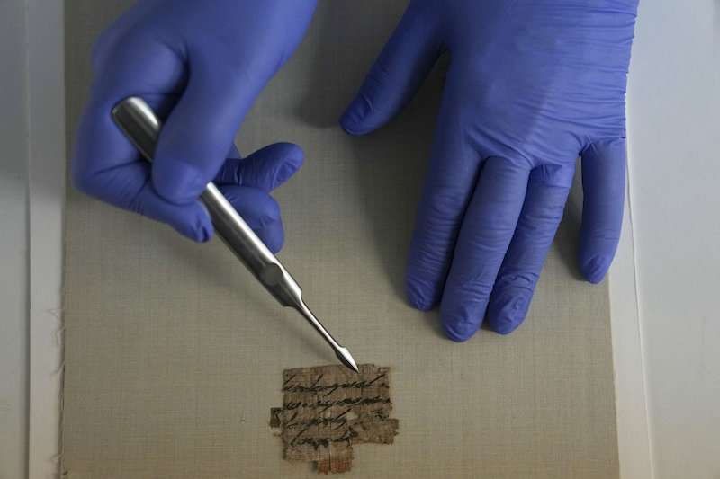 Resmi konservatör Tanya Bitler, Kudüs’teki İsrail Müzesi içindeki laboratuvarlarında papirüs parçasını gösteriyor.