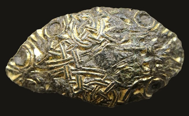 Arkeologların Viking Çağı mezarlığında bulduğu yaldızlı toka. C: Arkeologlar, Ulusal Tarih Müzeleri, İsveç