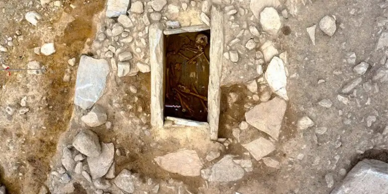 En az iki kişinin kalıntılarını içeren mezar, bir taş çemberle çevriliydi ve muhtemelen bir höyük ile örtülüydü.